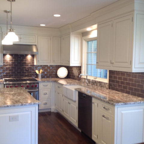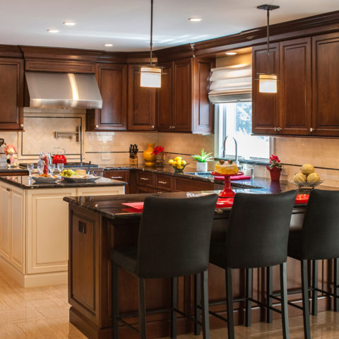 June 11, 2018This two-toned kitchen reno combines warm dark cherry with English linen cabinets. Titanium granite countertops, stainless appliances and...