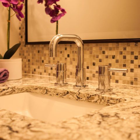 Quartz top, mosaic tile backsplash and chrome faucet tie our client’s powder room together. #njbathremodel #powderroomideas #designnj #bathtile #quartzcountertops #chromefaucets