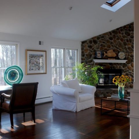 July 5, 2017Our client's beautifully renovated study off the new kitchen! #woodfloors #stonefireplace #glassart
