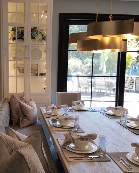 We built this custom glass curio cabinet to pair with the banquette seating in our client’s beautifully renovated kitchen! #banquetteseating #customglasscabinet #customcabinets #kitchenrenovation #njdesign #newjerseylife #kitchenseating #newjerseykitchenremodel #njkitchenrenovation