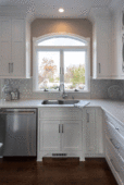 The back area on the right, with the beautiful arched window above the main sink, includes a smaller island used as the beverage area and seating. We also added a new window seat area. All in, our clients added a more open flow to their kitchen, plenty of seating for their active family and storage for all their needs.